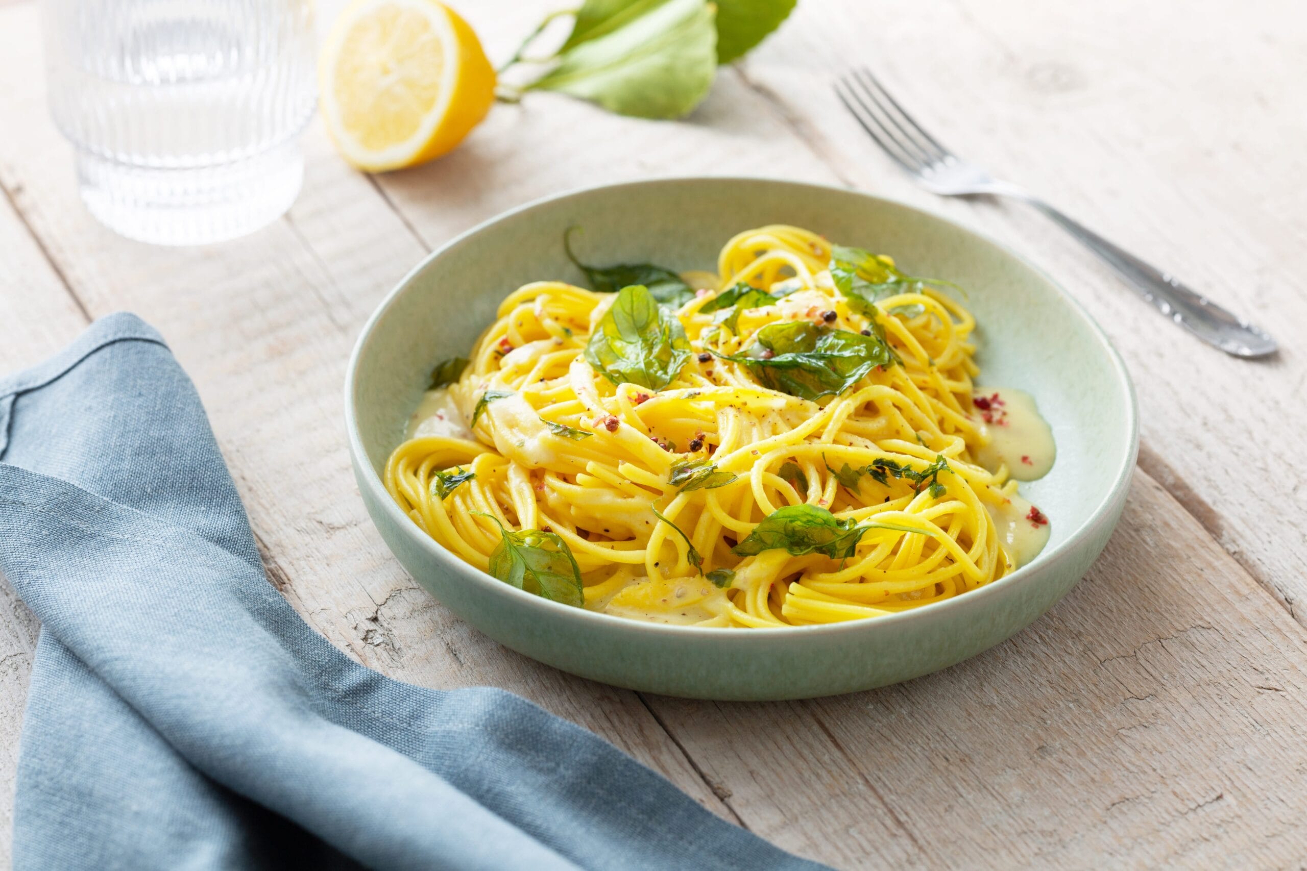 スパゲッティ、ペコリーノクリーム、レモン、バジル。
