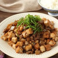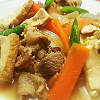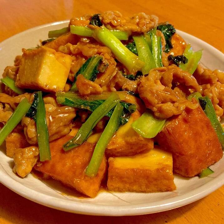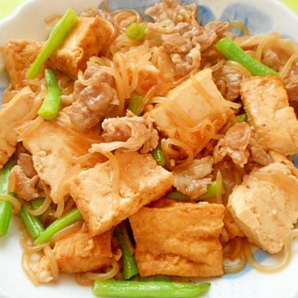 厚揚げとしらたき豚肉のかつお醤油炒め。