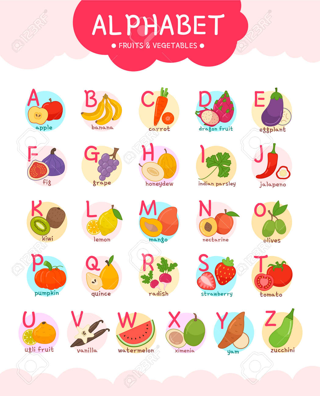 果物と野菜のアルファベット。ベクターフード教育ポスター。かわいい手書きの食べ物の文字で文字を学ぶ」のベクター画像素材 ロイヤリティフリー2210744741Shutterstock。