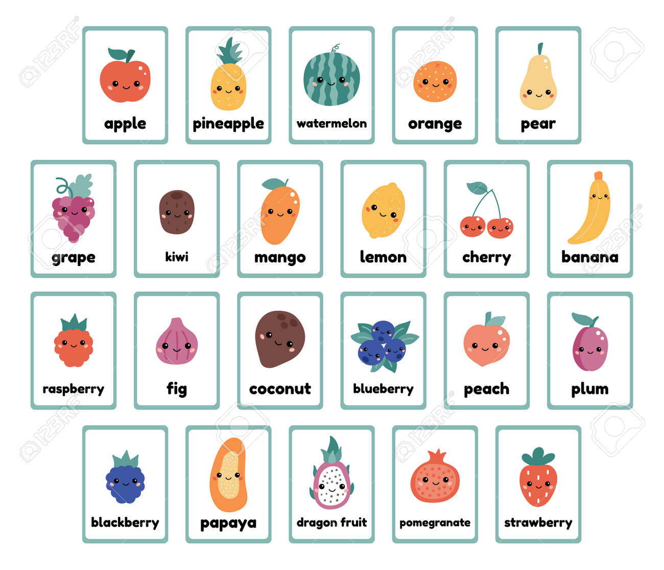 英語の単語を学ぶための印刷可能なフルーツとベリーのフラッシュカードコレクション。顔のかわいい漫画カワイイ食べ物。幼稚園、生徒、就学前の子供向けの教育ゲーム。ベクトルイラスト。のイラスト素材・ベクターImage 170250517。