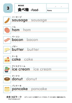 英語英単語練習プリント 食べ物全4種まめつぶワーク。