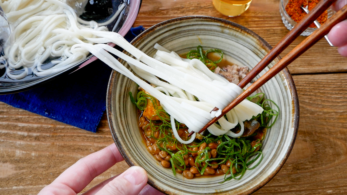 ひっぱりうどん 納豆・鯖缶入れて、一度食べてみて!山形のソウルフード、ひっぱりうどん #16。