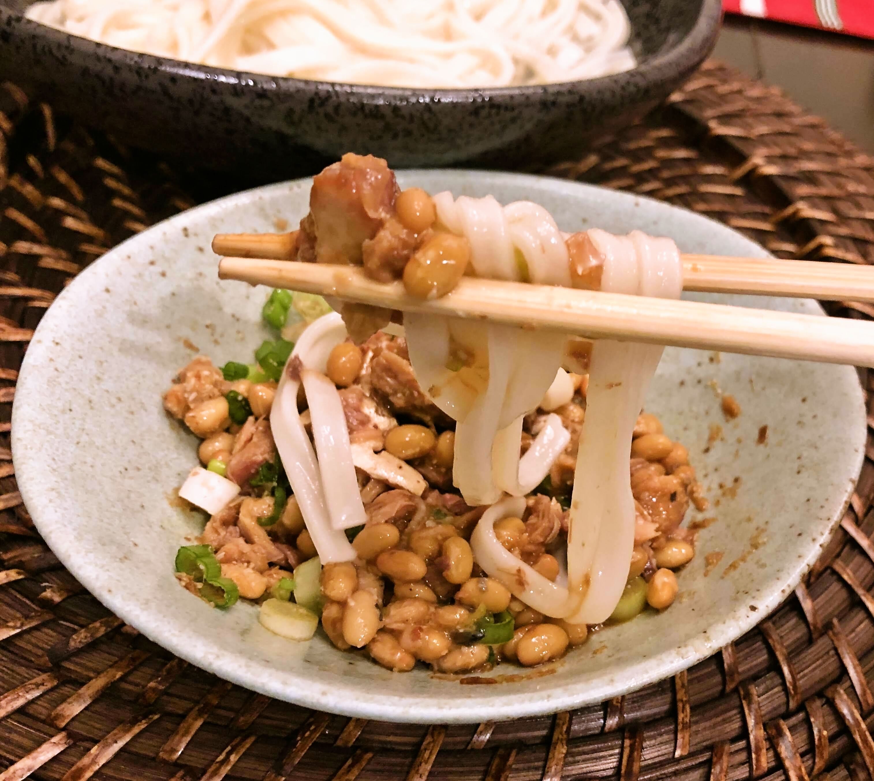 山形名物☆サバ缶と納豆でひっぱりうどん。