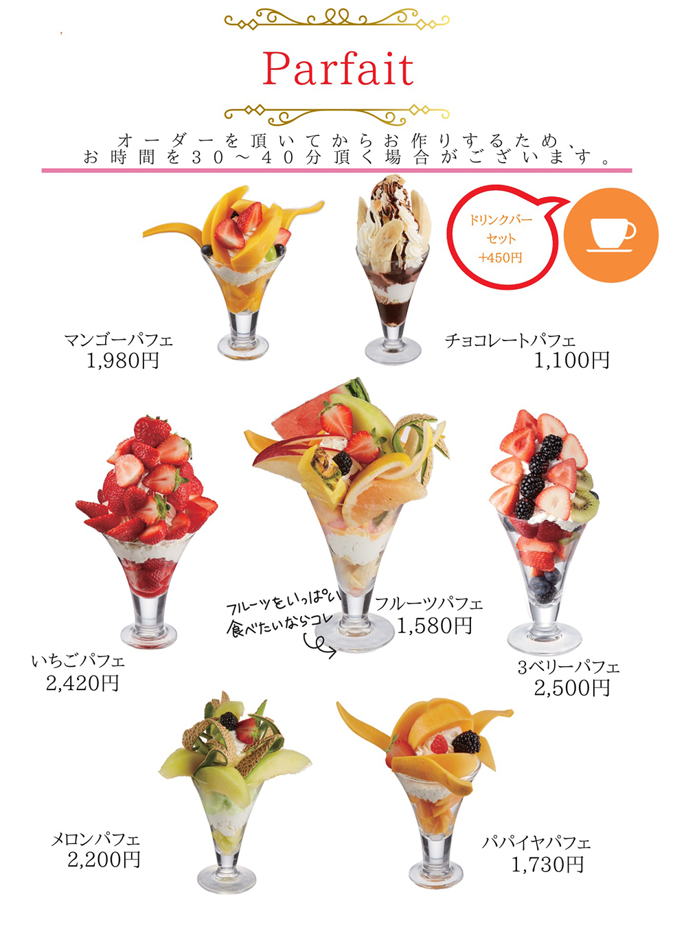 食事メニュー<リーベル横浜ランドマークプラザ店 定番>フルーツパフェ パンケーキ フルーツサンドなら果実園。
