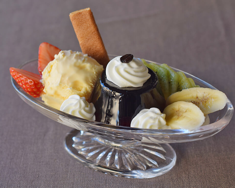 浅草の老舗喫茶店では、苦味際立つ香りのいいクラッシュゼリーに濃厚なソフトクリームがたっぷりと盛り付け られたこちら。このままプレーンでいただくと苦味と甘味のコントラストがとてもよいハーモニーを作り出し、ほろ苦い珈琲の風味と共に味わい深く口の中に広がって。
