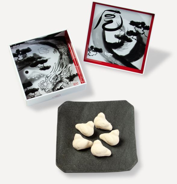 昨年より登場した『小鳩豆楽』の干支バージョンでございます。 『小鳩豆楽』が20粒入った缶の中には八岐大蛇をイメージした絵が描かれています。胴と蓋を合わせると絵が完成されます。税込価格1,080円、12月17日より販売させて頂きます。鎌倉 豊島屋 鳩サブレー 小鳩豆。