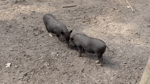 農場に住む2匹のかわいいブタが、食べられる物をさがして地面を探し回る。晴れた日の屋外で互いに面白い黒い小さな子豚の口。4k 25FPSで農業と豚の繁殖のコンセプト」の動画素材 ロイヤリティフリー 1104909311Shutterstock。