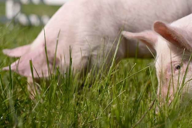 小さな豚は豚の草を種蒔きで食べるPremium写真。