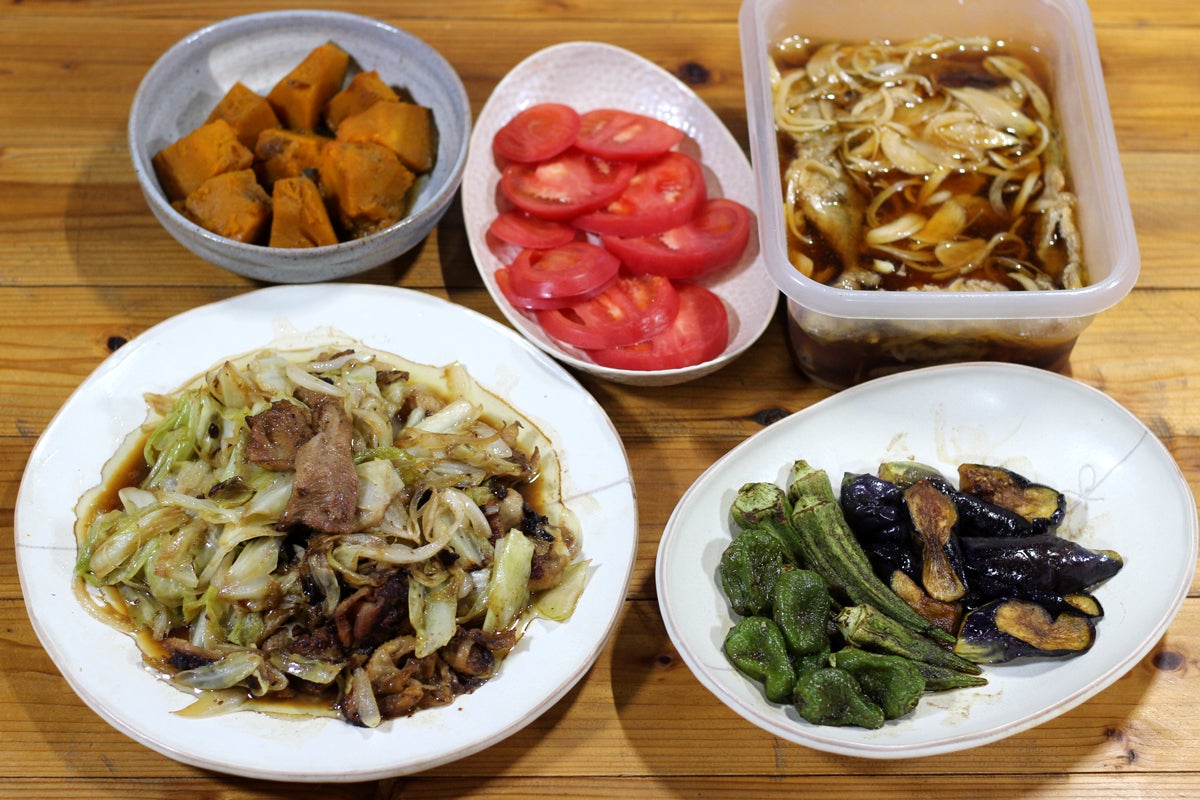 自家栽培ピーマン・オクラ・ナスの揚げ浸し、鶏皮とキャベツの味噌炒め、アジの南蛮漬けほか。日刊しまの食卓。