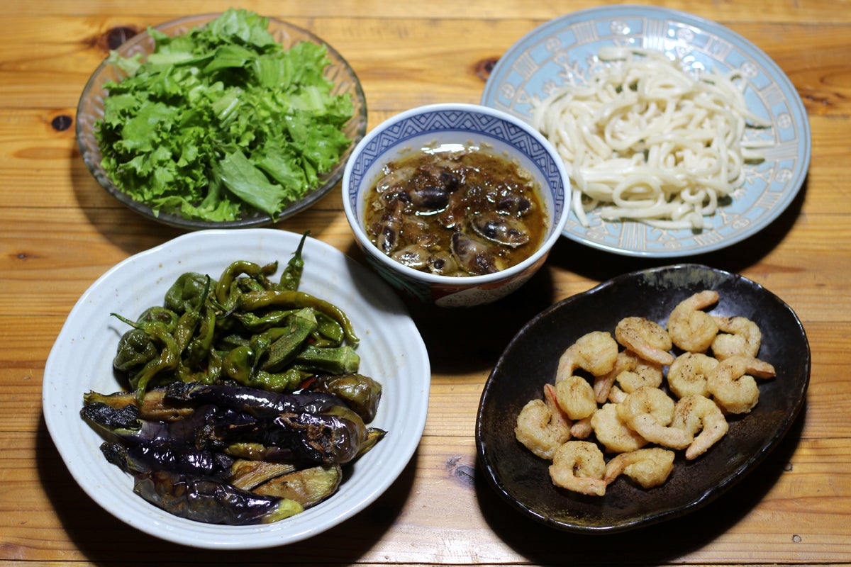 自家栽培ピーマン・ナスとゴーヤの揚げ浸し、シシトウとイリコの炒めもの、オクラのタタキ、そうめん。日刊しまの食卓。