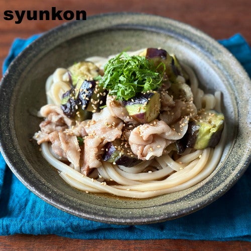 「焼きなすと豚こまみその冷やしぶっかけうどん」レシピ。