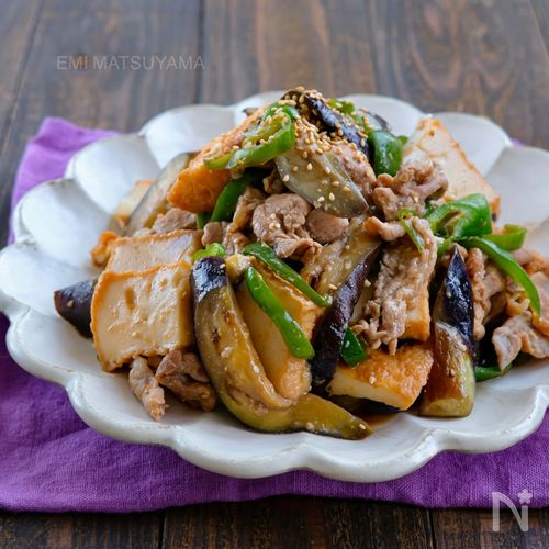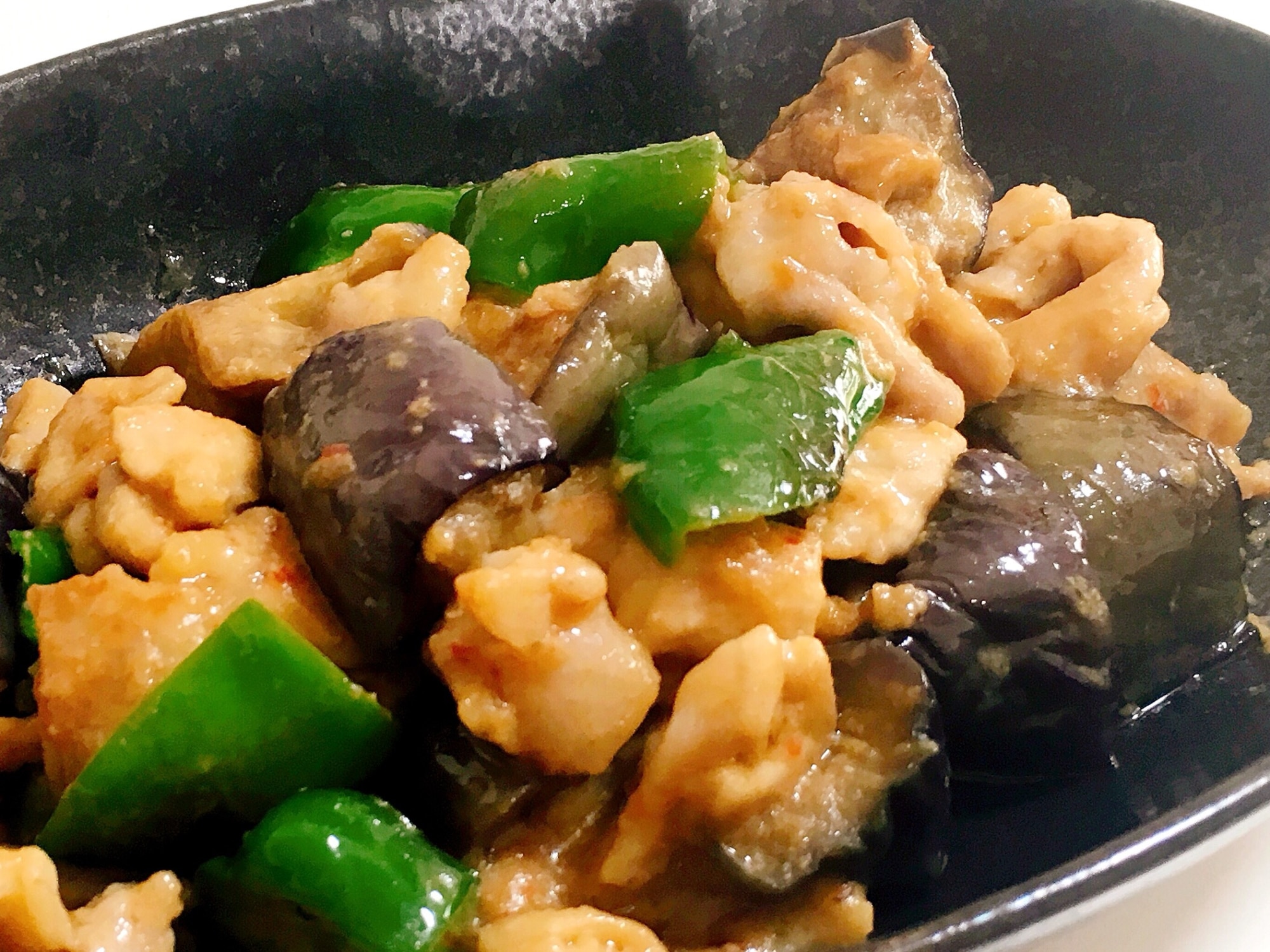 冷凍揚げなす・豚こま肉・厚揚げ・ピーマンの味噌炒め。