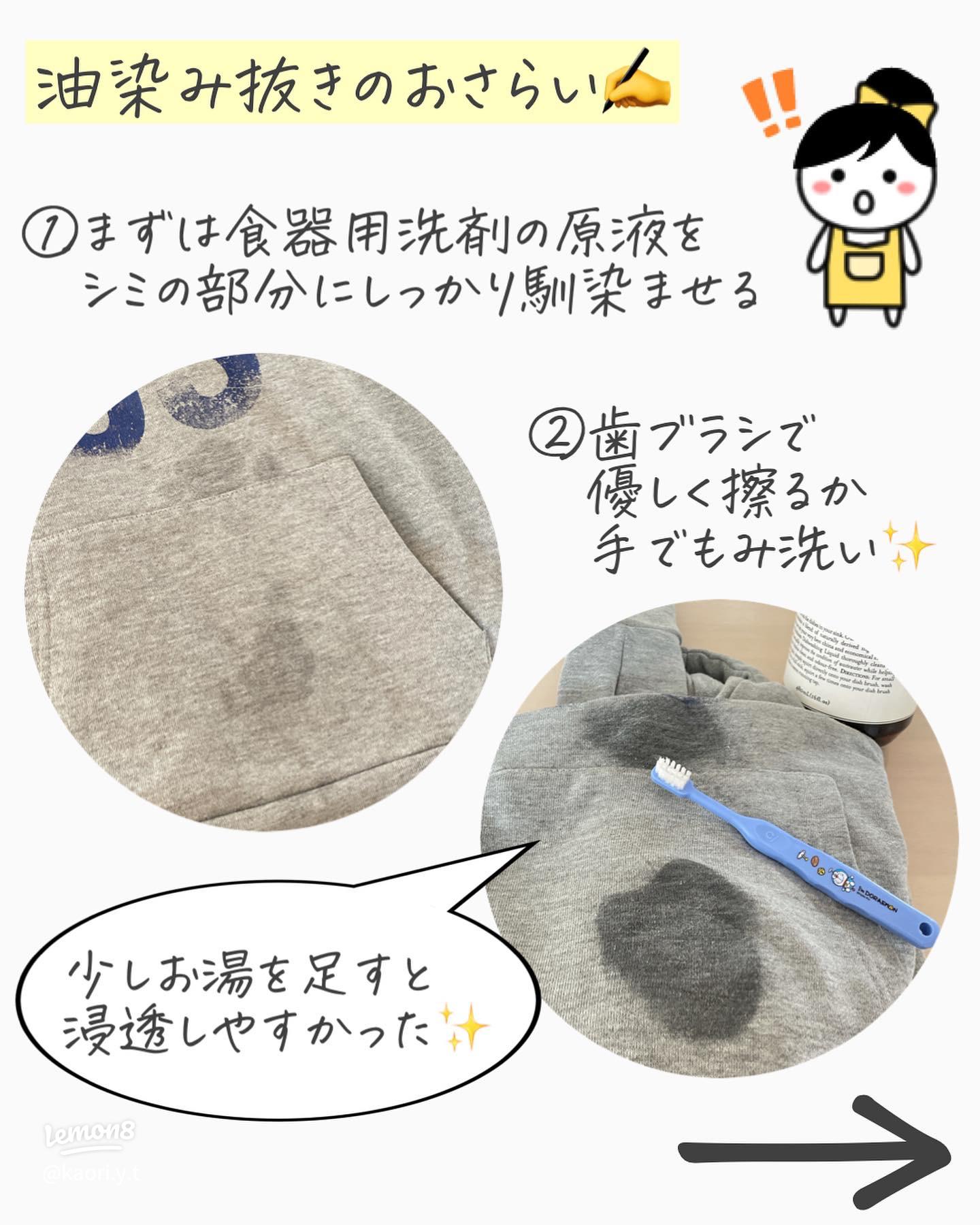 宅配クリーニングGiVuが教える衣類についた油汚れの落とし方🙊 みんなも是非真似してみてね🎶クリーニング 宅配クリーニング GiVu ライフハック ワーママ 子供のいる暮らし 時短家事 ライフスタイル 主婦 家事 洗濯代行サービス 家事ラク 洗濯 柔軟剤 汚れ 裏技 暮らしの知識 油汚れ おすすめ おすすめにのりたい。