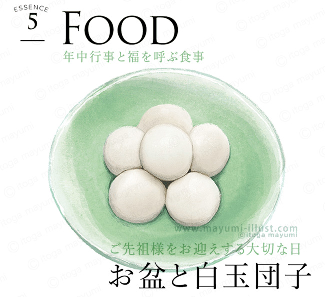 お仕事 福を呼ぶ行事食 白玉 団子 食べ物 イラスト » イラストレーター イトガマユミ女性向けイラスト,美容,健康,エクセサイズ,食べ物, イラスト制作・ポップ・おしゃれ・リアル。