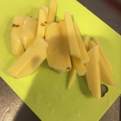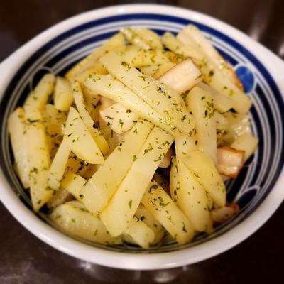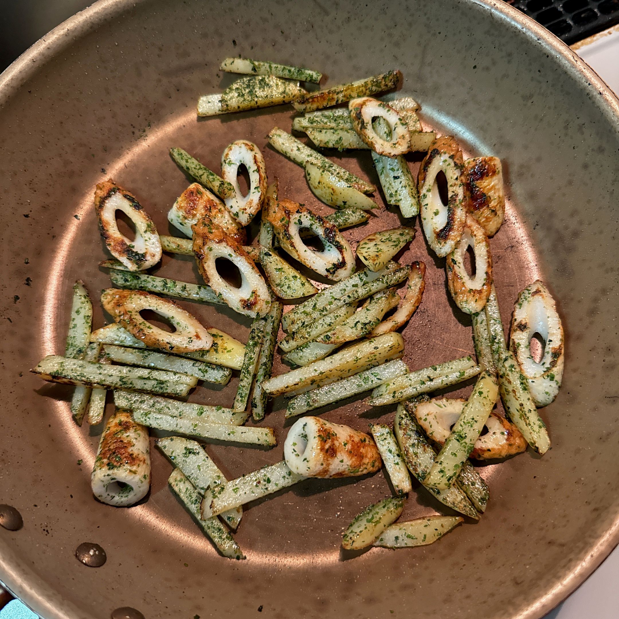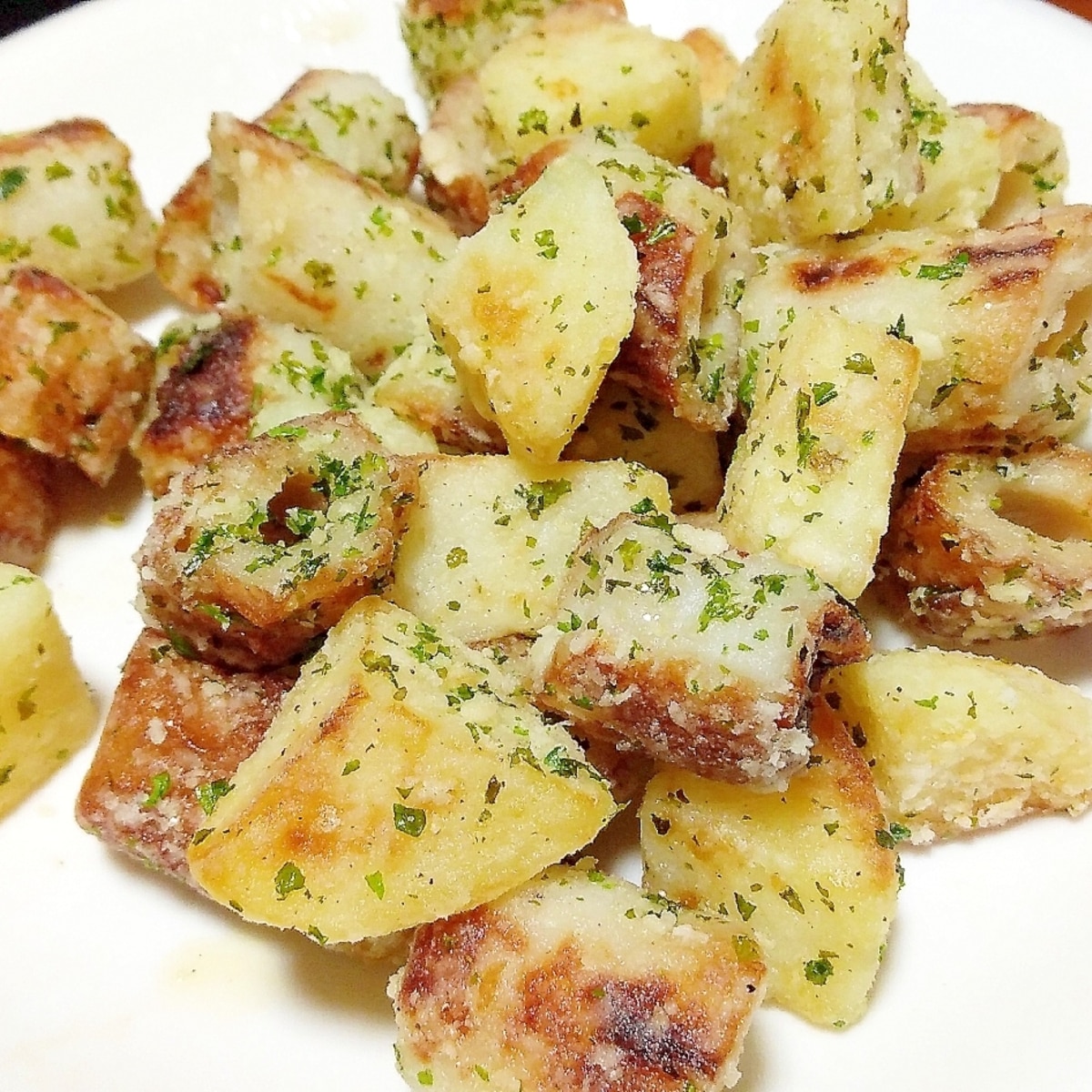 スティックじゃがいもと竹輪の青のりバター炒め。