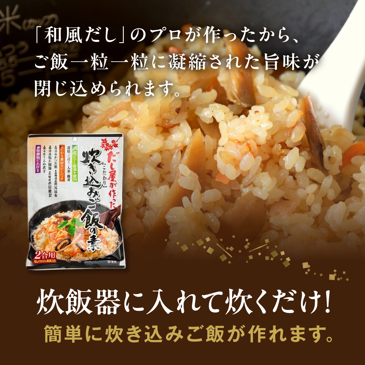 だし屋が作った 炊き込みご飯の素味の染み込みやすい乾燥具材を使用し、弊社自慢の「伝承極旨だし」とオリジナルの醤油ダレを追加した贅沢な炊き込み御飯の素です。炊飯器に入れて炊くだけ!簡単に炊き込みご飯が作れます。 「和風だし」のプロが作ったから、ご飯一粒。