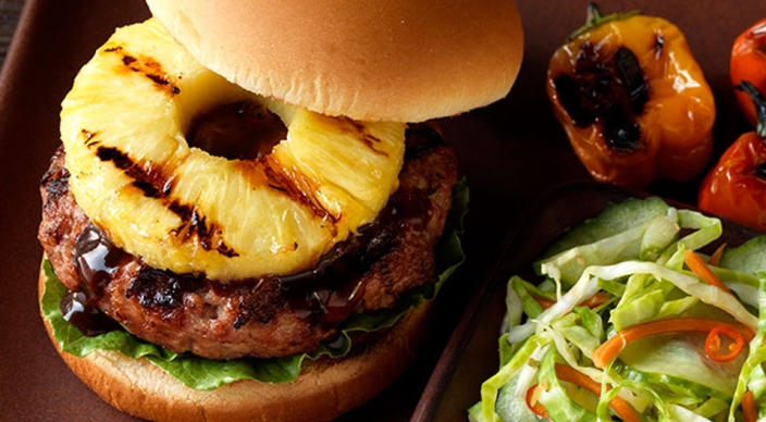 Weber Grill ウェーバーグリルのバーベキューレシピ: ゴマと海鮮ジャンのパイナップルポークバーガ。