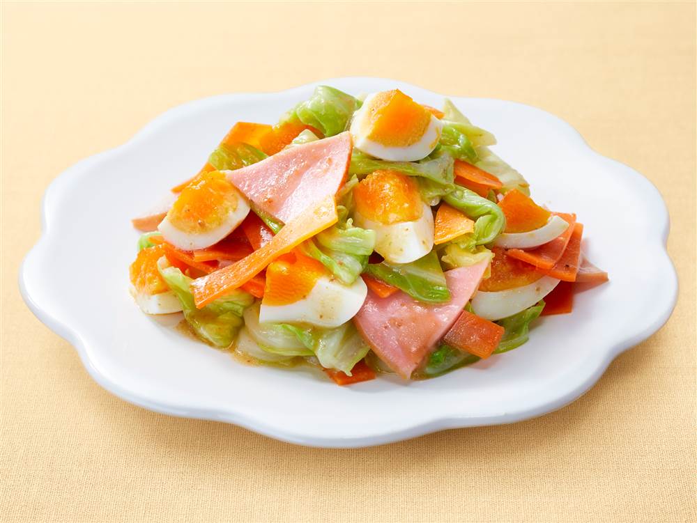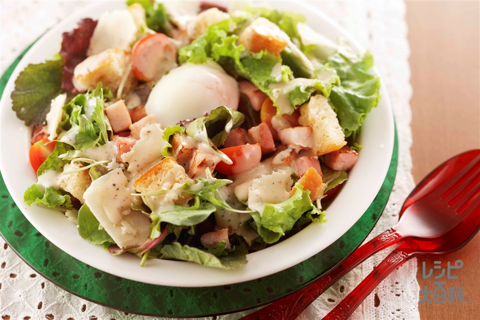 千切りキャベツとハムの温玉のせシーザーサラダ。