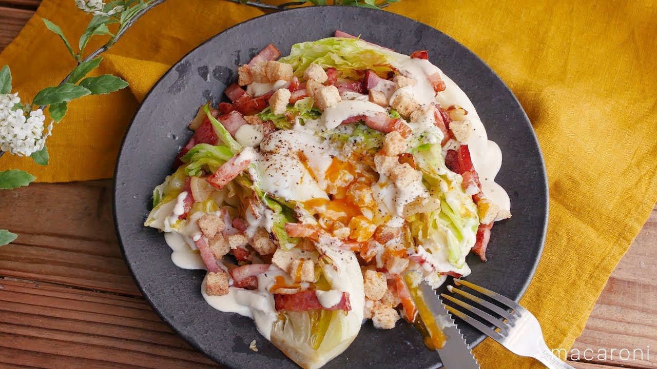 温玉を絡めて召し上がれ♪「焼きキャベツのシーザーサラダ」のレシピ・作り方 - YouTube。