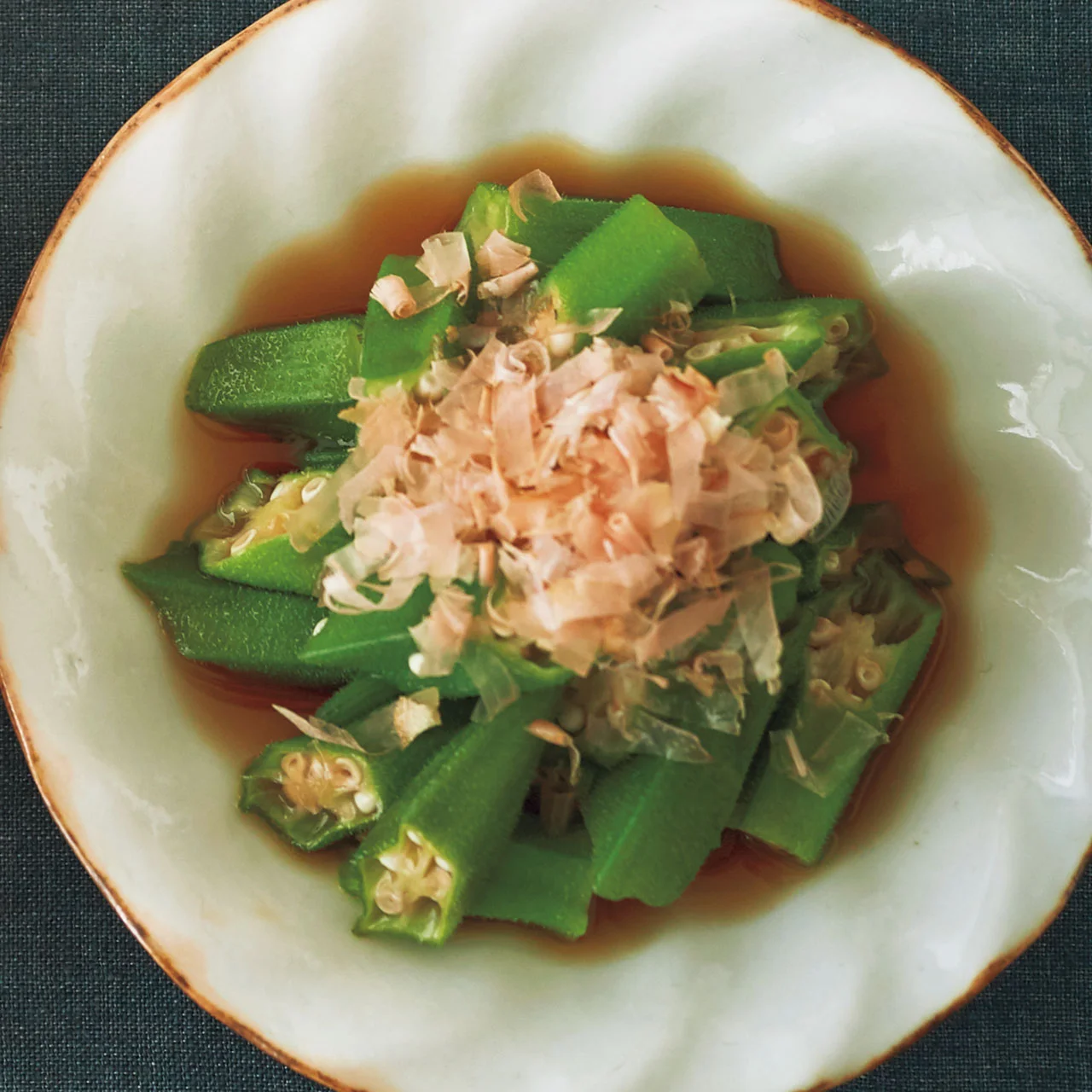 だしにつけるだけ簡単副菜!ゆでオクラのおひたし 副菜。