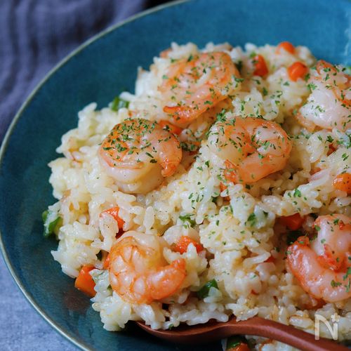 残りご飯で簡単本格的!バター香る 海老ピラフ。