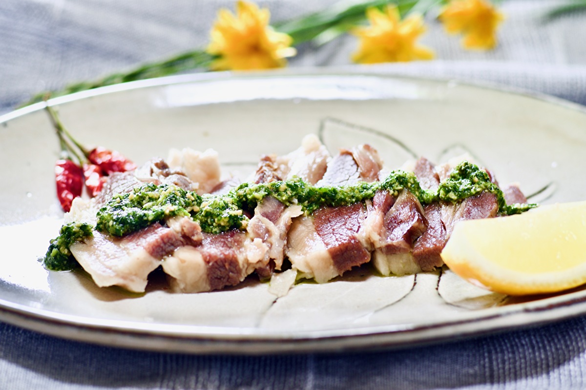 茹で塩猪 豚 のパクチーソース掛けワインによくあうジビエ料理 作り方・レシピ新料理物語。