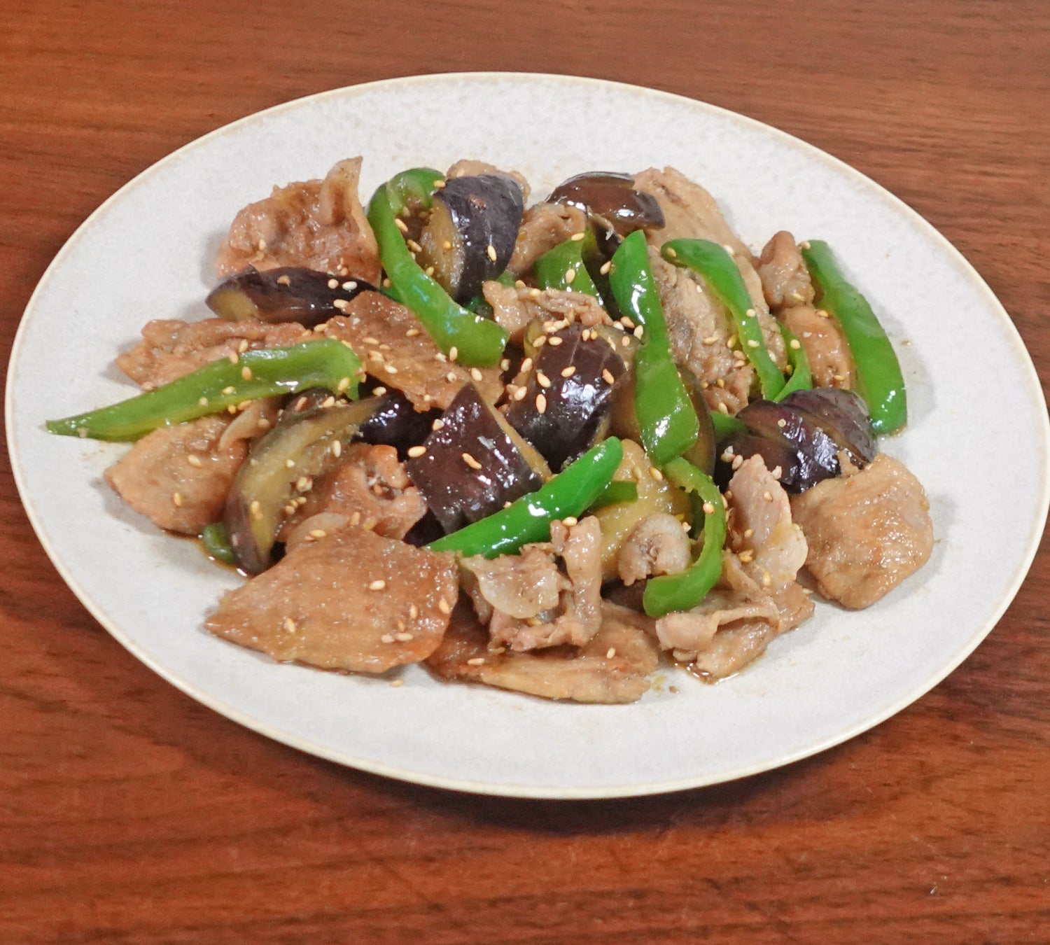 豚肉となすとピーマンの甘辛味噌炒めのレシピ。
