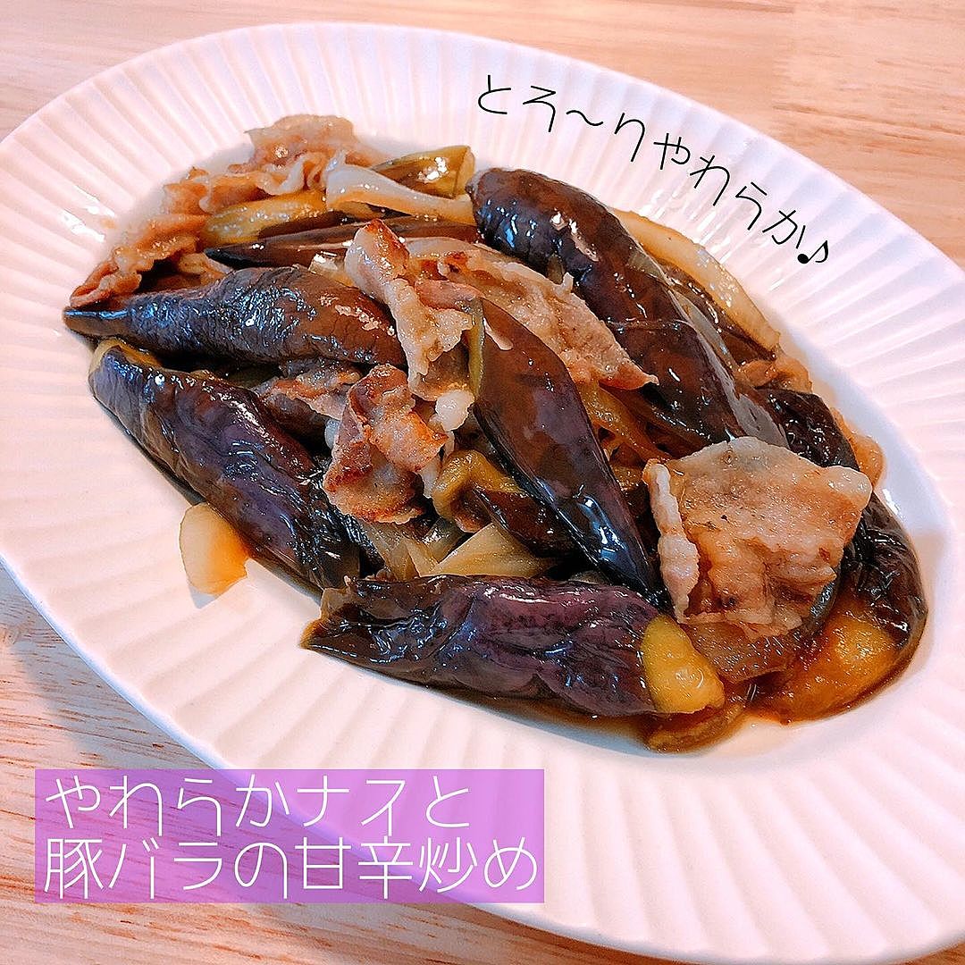 とろっと美味しい♡ 豚バラとなすの甘辛炒め🍆 トロトロなすと豚バラが相性抜群の一品です😋 📍材料 2人分なす 2本 豚バラ肉薄切り 150g片栗粉、サラダ油 各大さじ1 ☆酒、みりん 各大さじ1.5 オイスターソース 小さじ2 砂糖、しょうゆ 各小さじ1 📍作り方 ①。