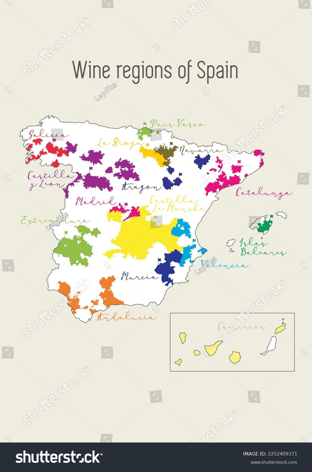 スペインワインの地図。ラ・リオハ、ガリシア、カタルーニャなど、スペイン語でワインを生産しているスペインのブドウ園の地図」のベクター画像素材 ロイヤリティフリー2252409371Shutterstock。