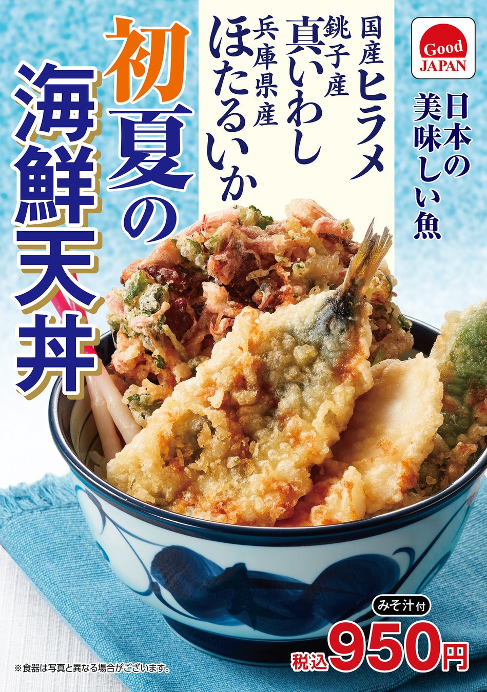 天丼てんや 初夏限定メニューを4月25日 木 から販売開始!銚子産真いわし・兵庫県産ほたるいか・国産ヒラメの『初夏の海鮮天丼』と北海道産肉厚帆立・天然大海老・活〆穴子の豪華な『ご馳走天丼』登場!ロイヤルホールディングス株式会社のプレスリリース。