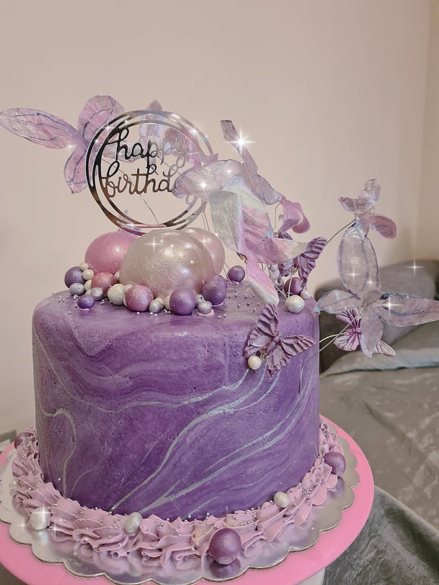 2回目の注文だよ。紫の大理石ケーキに、銀色の飾りと蝶々をつけてほしいって。気に入ってくれるといいな! : r Baking。
