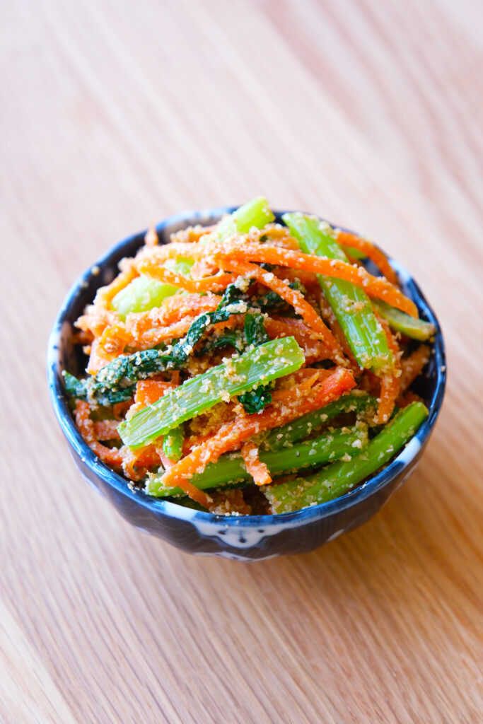 レンジで簡単♪小松菜とにんじんのごま和えゆり子のおいしい暮らし。