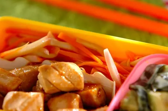 レンジで鶏甘辛煮の献立 副菜:ミックスビーンズとにんじんのごま風味サラダ、副菜 :大根とザーサイの中国風ホットピクルス 献立・メニュー 味の素パーク たべる楽しさを、もっと。