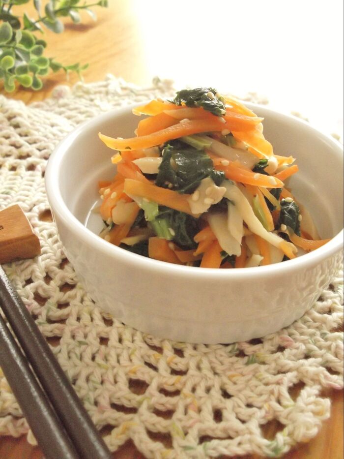 レンジで簡単!彩り副菜♡ 小松菜と人参の和風ツナサラダ。