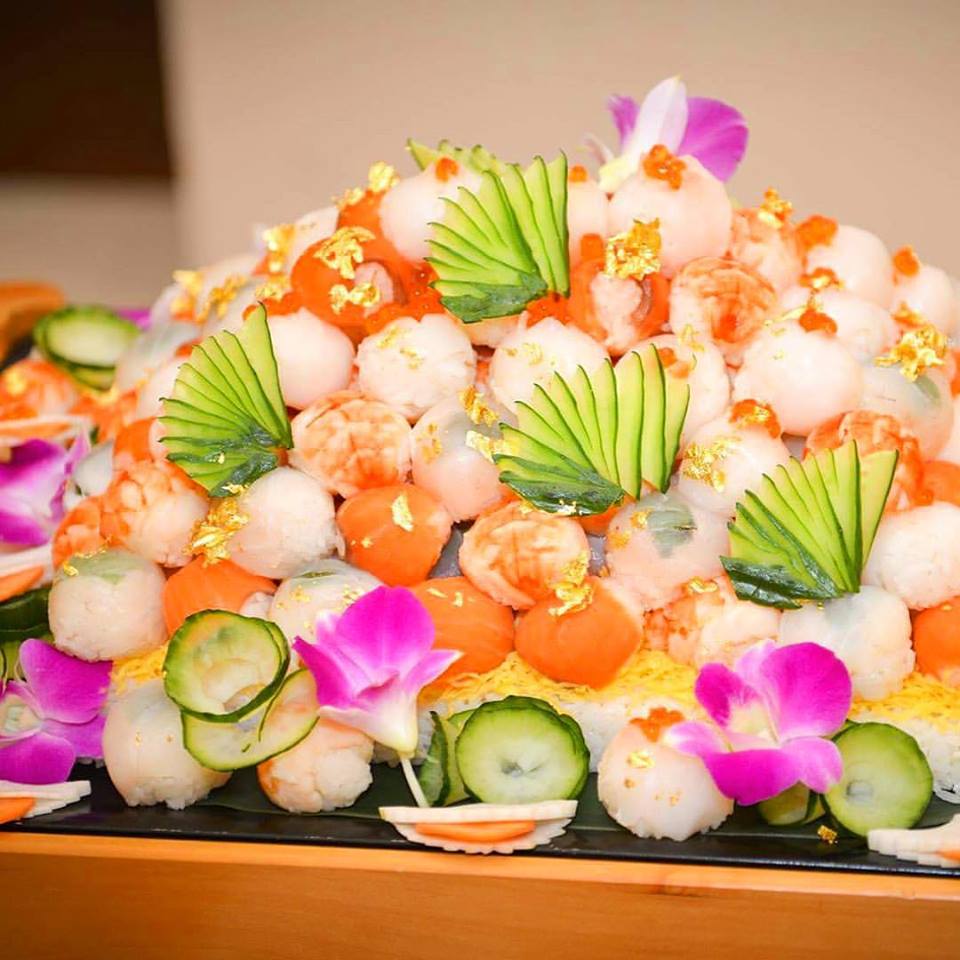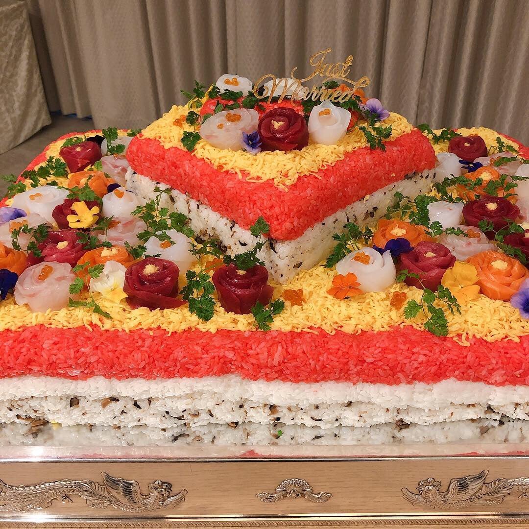 🍣 お寿司ケーキ ケーキ入刀・ファーストバイトなどに使用されるケーキを、新郎新婦が大好きなお寿司をウェディングケーキとしてへ変身🐣3段になっていて、 1番上の段をちらし寿司ケーキにして入刀 2.3番目を手毬寿司に、各セレモニーやその後ブッフェスタイルで提供した。