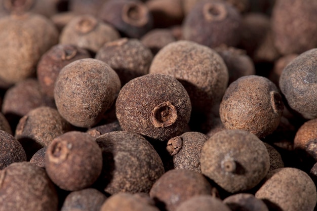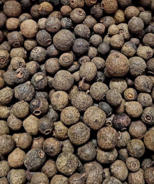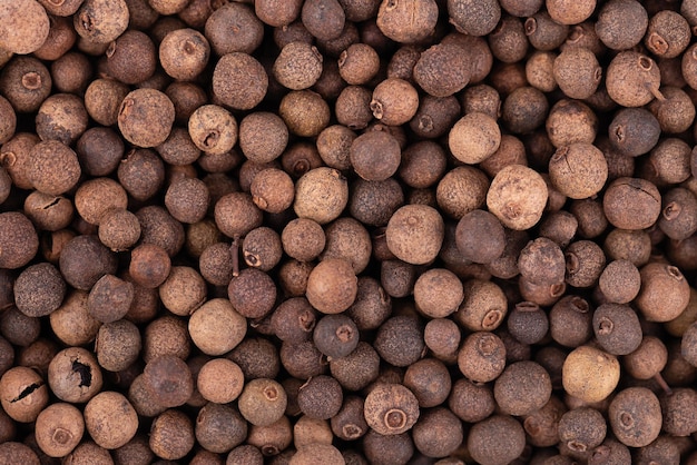 オールスパイスの背景ジャマイカペッパーピメントベリーオールスパイスペッパーコーンまたはマートルペッパーPremium写真。