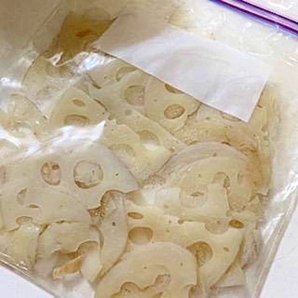 冷凍保存方法 レンコンを酢水でアク抜きをして下ごしらえしてから冷凍保存。