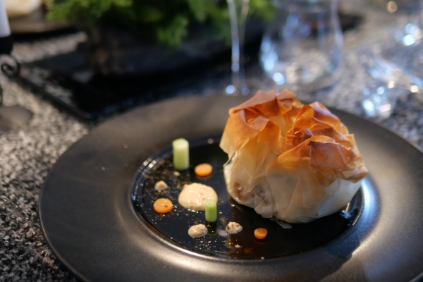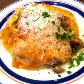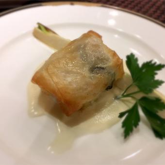 きのこのパートフィロ包み焼き 10月おまかせコースの前菜。
