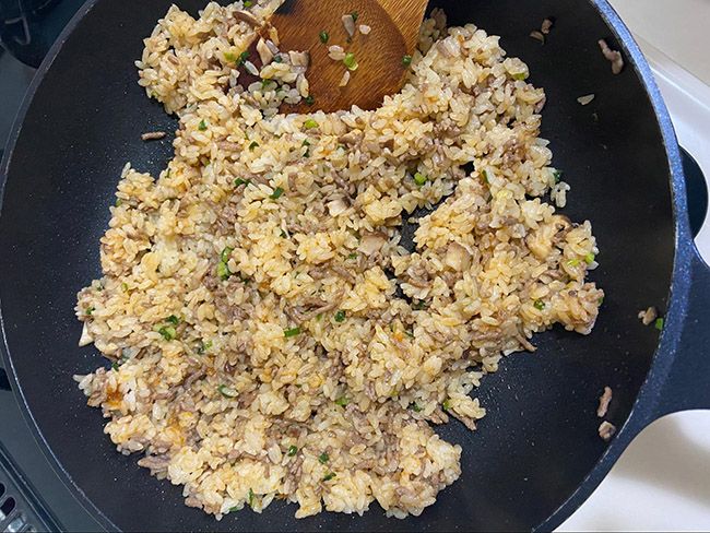 業務スーパーで買ったタイ料理の調味料 「トムヤムクン 鍋・スープの素」で トムヤムえびチャーハン作りました! 白ごはんを200g用意してフライパンを熱し 溶き卵をフライパンに入れたら 白ごはん、玉ねぎ、ピーマン、 パプリカ、えびを入れて炒め 仕上げに。