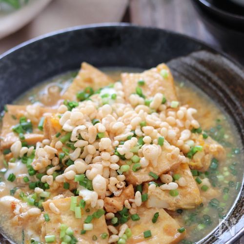さっと煮るだけ!5分で簡単天とじ風「豆腐と揚げ玉の卵とじ」 - 朝時間.jp。