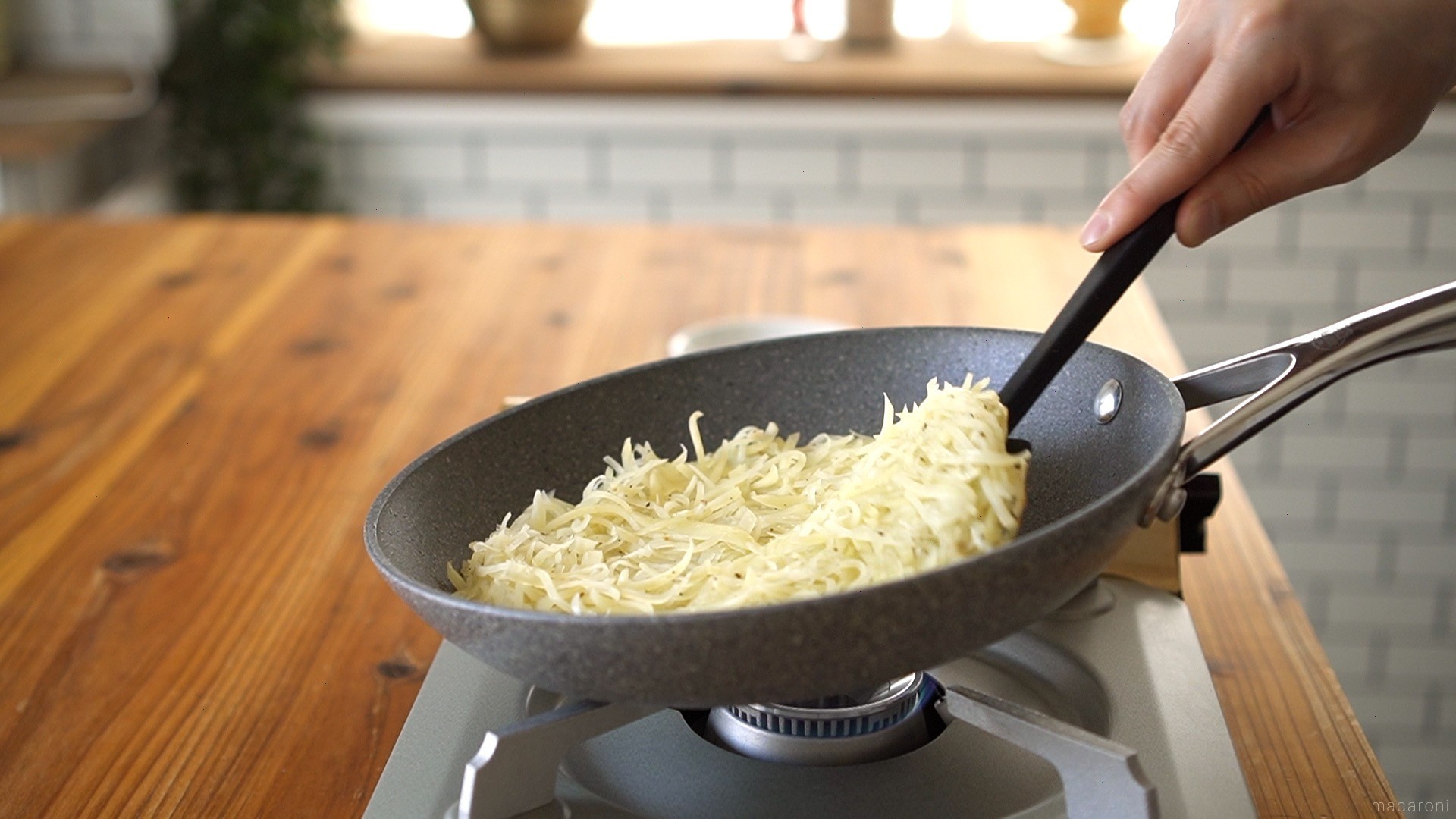千切りじゃがいものフライパンピザ」の作り方!カリカリのおいもにチーズが絡んで最高 - 桜雨のおいしいブログ。