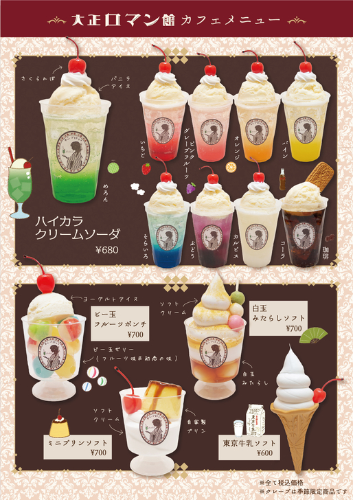 大正ろまん館のカフェ、メニュー、予約、クリームソーダ、クレープ。