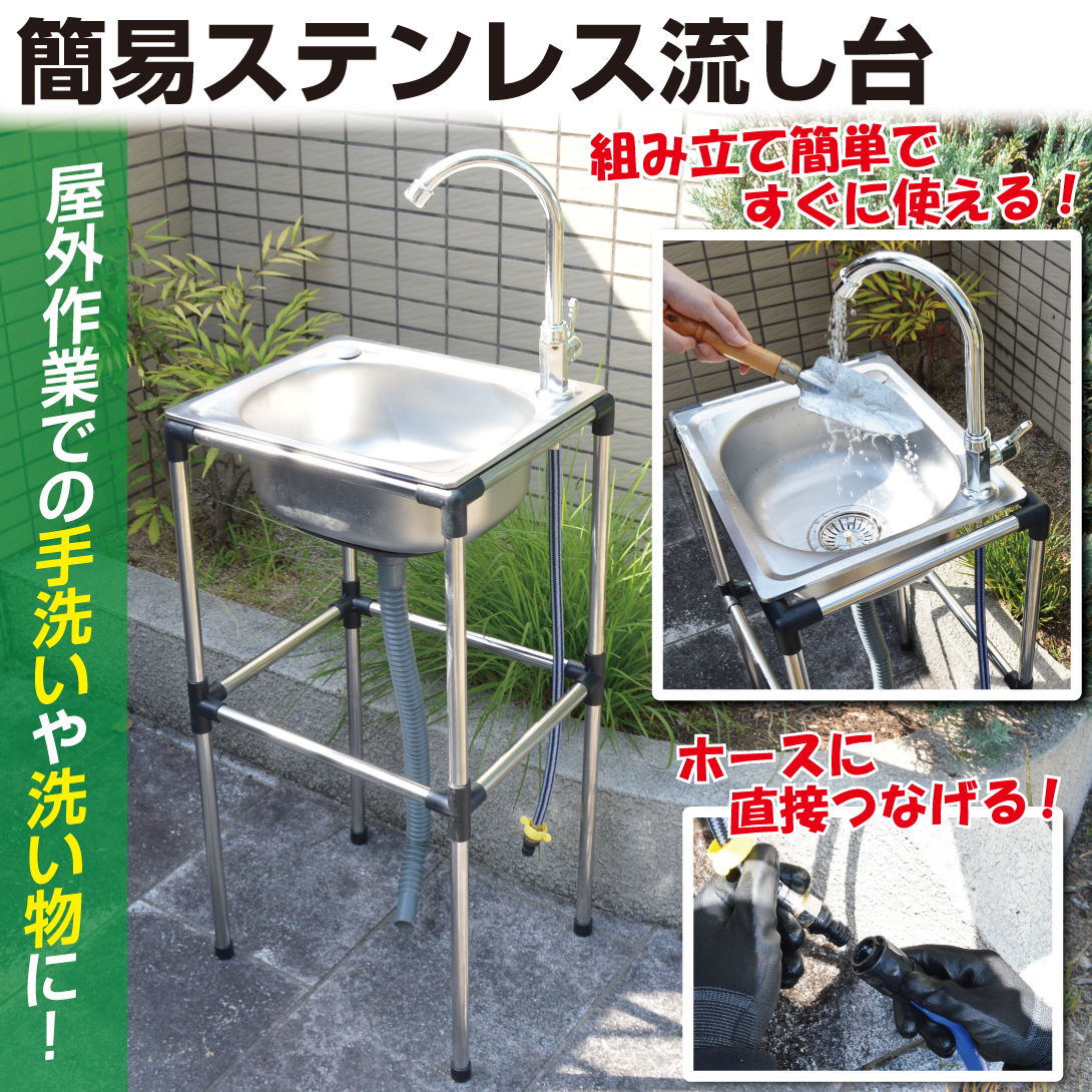 流し台 シンク 簡易式 ステンレス製 キッチン 一槽シンク ゴミ受け ガーデン 水回り 野菜洗い 屋外 庭 農園 工場 アウトドア キャンプ 水栓流し台簡易式ステンレス製庭野菜洗い工場ガーデン水回り屋外シンクゴミ受け農園キッチンアウトドア排水ホースキャンプ水栓 流し台。