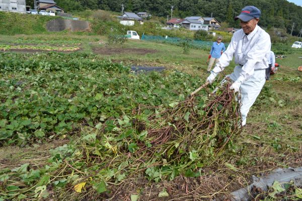 サツマイモの「つる返し」は、芋を太らせるための大事な作業。