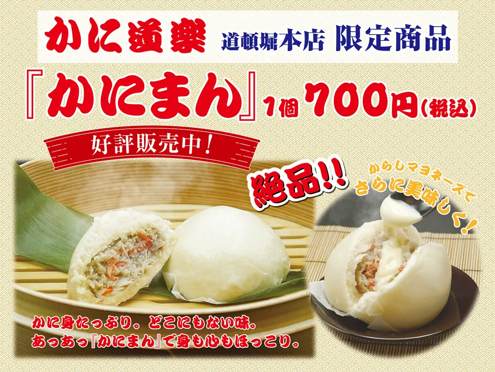 ミナミと言えばかに道楽。「かに道楽 道頓堀本店」の店前で売られている『かにまん』は見逃せない : 大阪つーしん -大阪市の地域情報サイト。