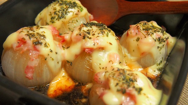レンジでチン!丸ごと新玉ねぎのめんつゆチーズ。