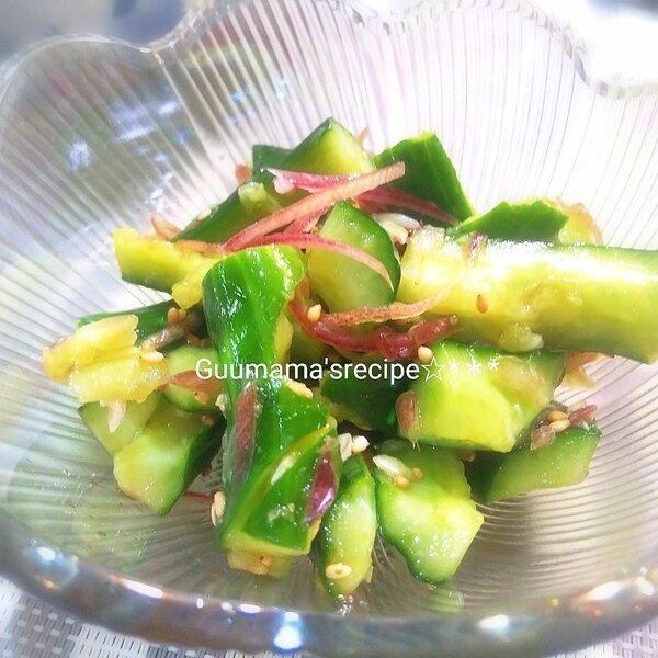 たたききゅうりとみょうがと紫蘇のやみつき漬け。