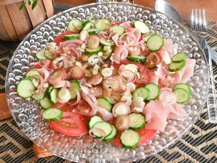 みょうがレシピ トマト、きゅうり、生ハムのみょうがサラダ。