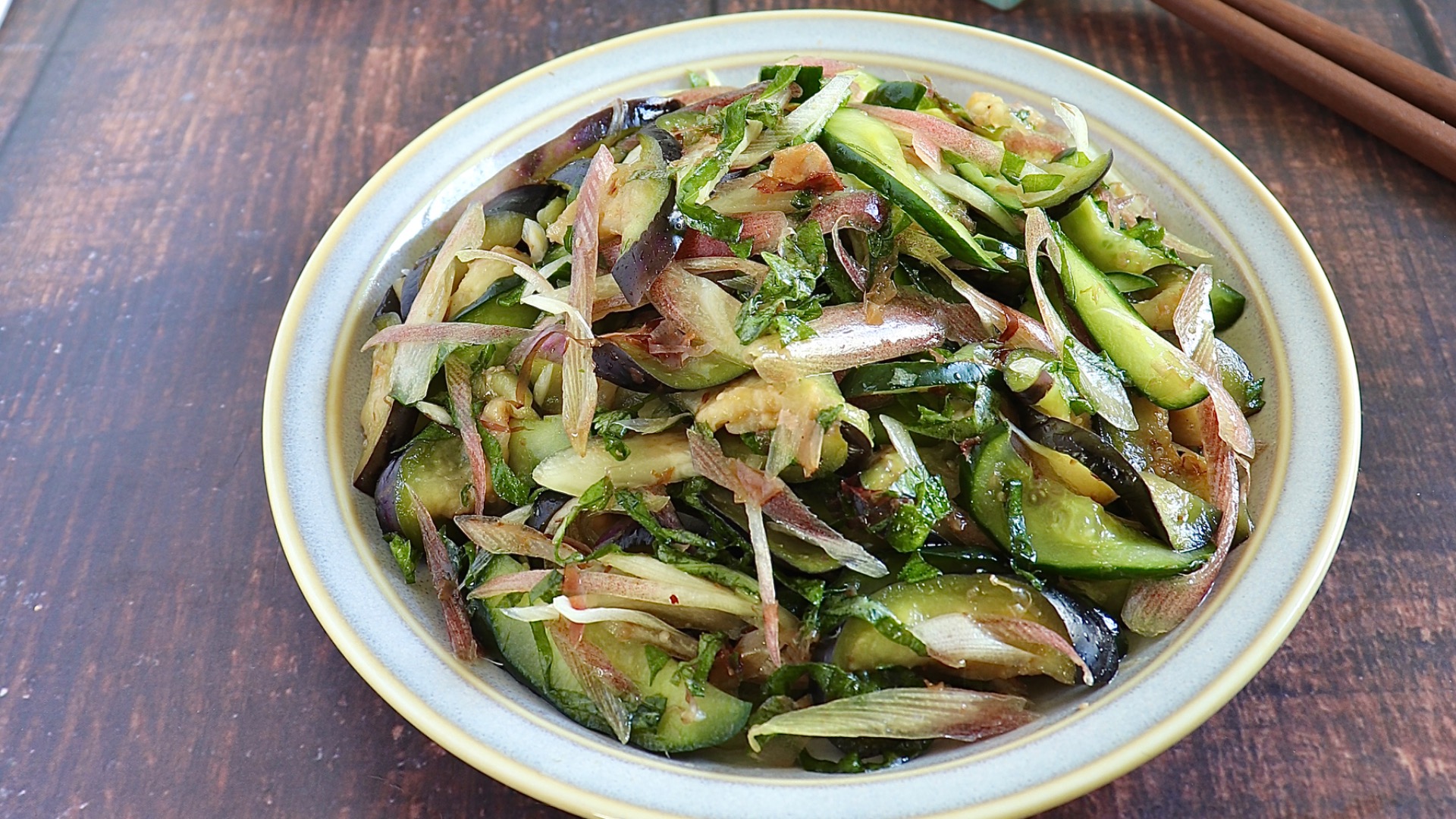 ナスとミョウガ きゅうりのもろみみそ和え。