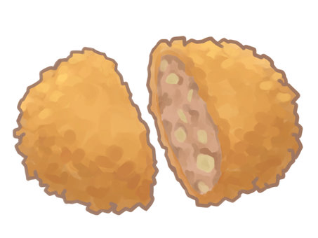 半分に切ったメンチカツ 料理・食べ物の手描き水彩イラスト素材のイラスト素材FYI08118628ストックフォトの QleanMarket キュリンマーケット。